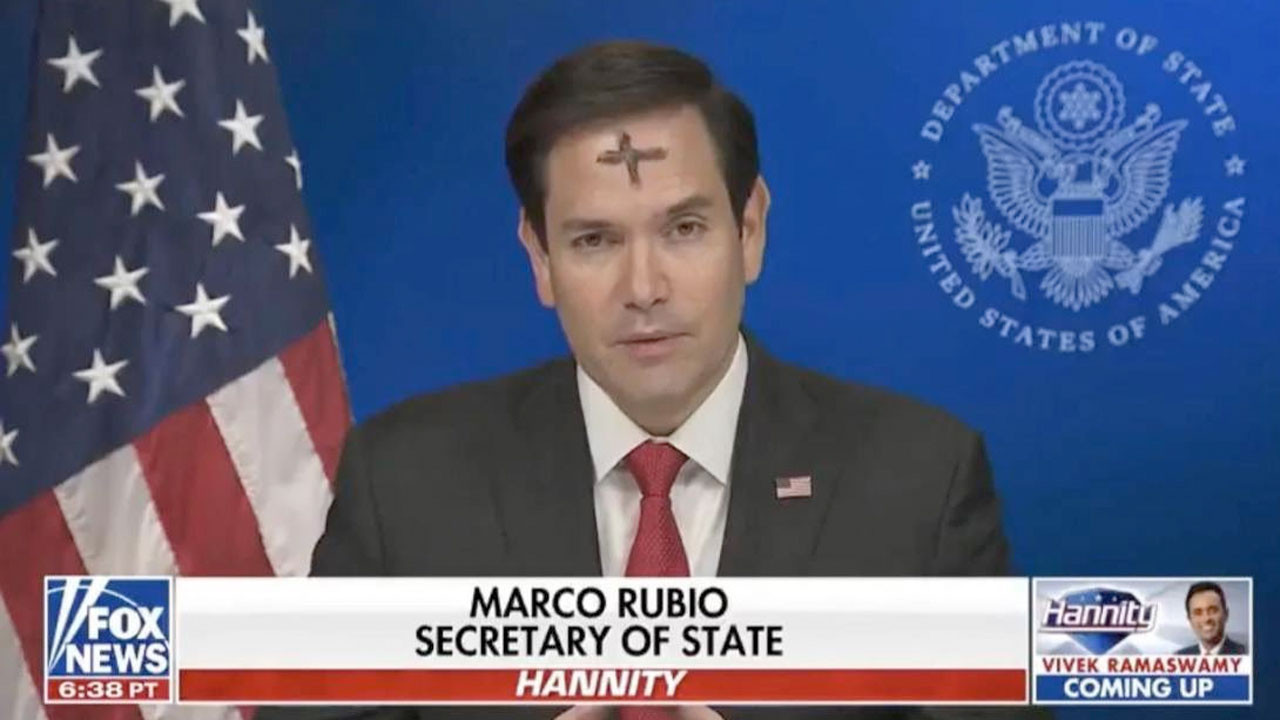ABD Dışişleri Bakanı Marco Rubio, Rubio, Hamas'ı tehdit ettiği Fox News programına alnına çizdiği haç ile çıktı.
