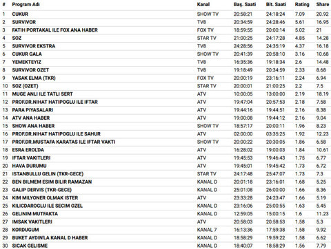 Galerinin tamamı için tıklayınızAB grubunda ise Show TV'de sezon finaliyle ekrana gelen Çukur 22.26 share ile zirvede yer aldı. İkinci sırada 25.36 share ile Fatih Portakal ile FOX Ana Haber yer alırken, üçüncü sırada ise 15.18 share ile Survivor yer aldı. ABC grubunda da Çukur 20.92 share ile zirvede yer alırken, Survivor 16.95 share ile ikinci, Fatih Portakal ile FOX Ana Haber ise 21 share ile üçüncü sırada yer aldı.