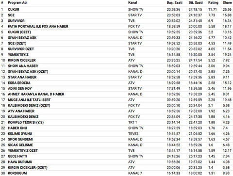 12 Mart 2018 reyting sonuçları Survivor'dan kim elendi Çukur ve Söz yarıştı