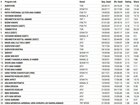 Galerinin tamamı için tıklayınız12 Nisan Perşembe günü reyting sonuçları belli oldu. Total'de 17.17 share ile TV8'de ekrana gelen Survivor zirvede yer aldı. İkinci sırada 14.95 share ile FOX TV'nin sevilen dizisi Bizim Hikaye yer alırken, üçüncü sırada ise 14.12 share ile Star TV'de ekrana gelen Avlu yer aldı.
