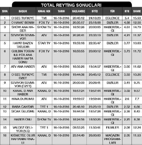 16 Ekim Pazar 2016 reyting sonuçları nasıl oldu, dün akşam yayınlanan dizilerden en çok hangisi izlendi? Acun'un programı 'O Ses Türkiye' zirveyi zorluyor mu? 16 Ekim reyting sonuçları internethaber'de. Dün akşam yayınlanan Seviyor Sevmiyor, Hayat Bazen Tatlıdır, Bodrum Masalı tekrar, O Hayat Benim, Arkadaşlar İyidir, O Ses Türkiye gibi dizi film ve yarışma programlarından hangisi Acunn reytinglerinde Pazar akşamı birinci oldu? TOTAL'de ve AB'de yayınlanan reyting sonuçlarında 'O Ses Türkiye' birinci geldi. İŞTE 16 EKİM PAZAR 2016 REYTİNG SONUÇLARI