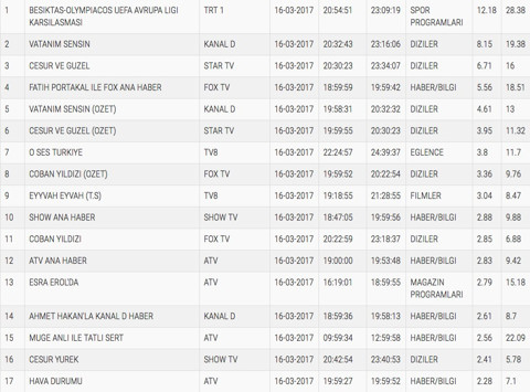 16 Mart 2017 Perşembe günü reyting sonuçları ne oldu? TRT 1 ekranlarında Beşiktaş maçının şifresiz yayınlanması reyting sonuçları nasıl etkiledi? Kanal D ve Star'ın perşembe akşamları yaşadığı reyting mücadelesinde gülen taraf kim oldu? Vatanım Sensin mi yoksa Cesur ve Güzel mi? 16 Mart reyting sonuçları internethaber'de. 16 Mart 2017 Perşembe günü reyting sonuçları belli oldu. TOTAL ve AB sıralamasında kim birinci oldu? Beşiktaş maçı mı yoksa Vatanım Sensin mi? 16 Mart 2017 Perşembe günü reyting sonuçlarına göre gecenin birincisi Beşiktaş maçı oldu. Beşiktaş maçını Vatanım Sensin ile Cesur ve Güzel izledi. İŞTE 16 MART 2017 PERŞEMBE GÜNÜ REYTİNG SONUÇLARI