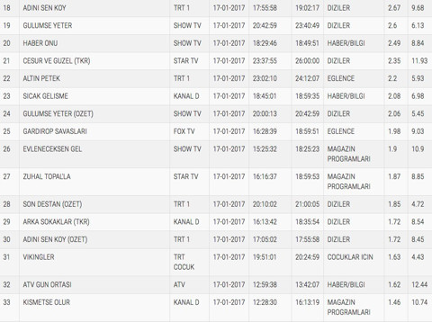 17 Ocak 2017 Salı günü reyting sonuçları ne oldu? Eşkıya Dünyaya Hükümdar Olmaz'ın yayınlanmaması reyting sonuçları nasıl etkiledi? Star Tv'de yayınlandığı günden itibaren zirveyi zorlayan Anne dizisi dün akşam ne yaptı? Ahmet Hakan ve Fatih Portakal'ın haber savaşında kazanan kim oldu? 17 Ocak reyting sonuçları internethaber'de. 17 Ocak 2017 reyting sonuçları belli oldu. TOTAL ve AB sıralamasına göre kim birinci oldu? Anne mi yoksa O ses Türkiye mi? 17 Ocak 2017 reyting sonuçlarına göre gecenin dizisi Anne oldu. İŞTE 17 OCAK 2017 SALI GÜNÜ REYTİNG SONUÇLARI