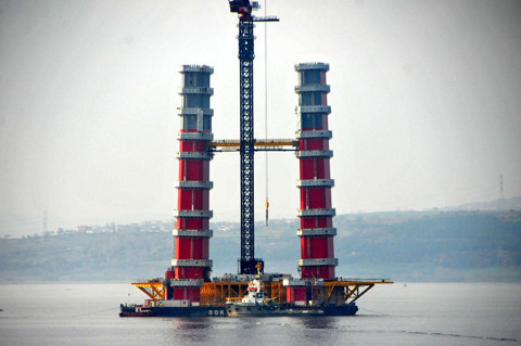 Cumhurbaşkanı Recep Tayyip Erdoğan tarafından 18 Mart 2017'de temeli atılan Çanakkale'nin Lapseki ilçesine bağlı Şekerkaya mevkisi ile Gelibolu'nun Sütlüce mevkisi arasında yapımı süren 1915 Çanakkale Köprüsü'nün ayakları her geçen gün biraz daha yükselmeye devam ediyor.Eylül ayında, her iki yakadaki köprü ayakları arasında bağ krişi montajı yapılmıştı. Bu kez de son yapılan çalışmaların ardından tarihi köprünün Avrupa yakasındaki deniz içindeki kesonları üzerine 9’uncu, Anadolu yakasındaki kesonları üzerine de 10’uncu bloklarının yerleştirilmesiyle köprünün ayakları 100 metre yüksekliğe ulaştı.Tamamlandığında 318 metreye kadar ulaşacak olan köprü ayakları bu montajın ardından biraz daha yükseldi.1915 Çanakkale Köprüsünün Cumhuriyet'in kuruluşunun 100'üncü yılını temsil etmesi sebebiyle orta açıklığının 2023 metre olması planlanıyor. Bu açıklık, dünyanın en uzun kuleler arası açıklığa sahip asma köprüsü olması özelliğini taşıyor.Köprü hizmete açıldıktan ise sonra iki yaka arasındaki ulaşım mesafesi 6 dakikaya inecek. Tarihi köprünün bölgeye de ciddi faydalar sağlayacağı ve özellikle Lapseki’ye yatırımcı talebinin artacağı tahmin ediliyor.Sürdürülen proje çalışmaları kapsamında 1 asma köprü, 2 yaklaşım viyadüğü, 4 betonarme viyadük, 6 alt geçit köprüsü, 38 üst geçit köprüsü, 5 köprü, 43 alt geçit, 115 çeşitli ebatlarda menfez, 12 kavşak, 4 otoyol hizmet tesisi, 2 bakım işletme merkezi, 6 ücret toplama istasyonu inşa edilecek ve 1915 Çanakkale Boğaz Köprüsü, 18 Mart 2022'de tamamlanarak hizmete açılacak.Haberin videosu için tıklayınız...