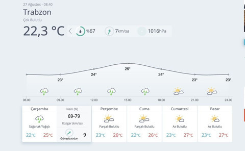 Yapılan uyarıda "Rüzgarın Marmara ile Kuzey Ege kıyılarında kuzey ve kuzeydoğu yönlerden kuvvetli (40-60 km/saat) olarak esmesi beklendiğinden yaşanabilecek olumsuzluklara karşı dikkatli ve tedbirli olunması gerekmektedir" denildi. Öte yandan Doğu Karadeniz'in kıyı kesimleri ile Hatay, Toroslar, Denizli çevrelerinde yağmur geçişleri görülecek. İşte 27 Ağustos Çarşamba bölge bölge hava durumu...Hava sıcaklığının, güney ve doğu kesimlerinde mevsim normallerinin üzerinde, diğer yerlerde mevsim normalleri civarında seyretmesi bekleniyor. Rüzgarın Marmara ile Kuzey Ege kıyılarında kuzey ve kuzeydoğu yönlerden kuvvetli (40-60 km/saat) olarak esmesi beklendiğinden yaşanabilecek olumsuzluklara karşı dikkatli ve tedbirli olunması gerekmektedir.