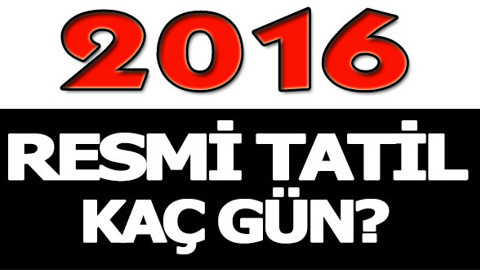 2016 yılında kaç gün tatil var? 2016'da kaç gün resmi tatil yapacağız, Ramazan Bayramı ve Kurban Bayramı 2016'da hangi fünlere denk geliyo? İşte merak edilen bu soruların cevapları... YILBAŞI 1. GÜN 01 OCAK CUMA ULUSAL EGEMENLİK VE ÇOCUK BAYRAMI 1 GÜN 23 NİSAN CUMARTESİ EMEK VE DAYANIŞMA GÜNÜ* 1 GÜN 01 MAYIS PAZAR ATATÜRK’Ü ANMA GENÇLİK VE SPOR BAYRAMI 1 GÜN 19 MAYIS PERŞEMBE RAMAZAN BAYRAMI AREFESi 1/2 GÜN 04 TEMMUZ PAZARTESİ RAMAZAN BAYRAMI 1. GÜN 05 TEMMUZ SALI RAMAZAN BAYRAMI 2. GÜN 06 TEMMUZ ÇARŞAMBA RAMAZAN BAYRAMI 3. GÜN 07 TEMMUZ PERŞEMBE ZAFER BAYRAMI 1 GÜN 30 AĞUSTOS SALI KURBAN BAYRAMI AREFESi 1/2 GÜN 11 EYLÜL PAZAR KURBAN BAYRAMI 1. GÜN 12 EYLÜL PAZARTESİ KURBAN BAYRAMI 2. GÜN 13 EYLÜL SALI KURBAN BAYRAMI 3. GÜN 14 EYLÜL ÇARŞAMBA KURBAN BAYRAMI 4. GÜN 15 EYLÜL PERŞEMBE CUMHURİYET BAYRAMI 1,5 GÜN 28 EKİM 29 EKİM CUMA CUMARTESİ