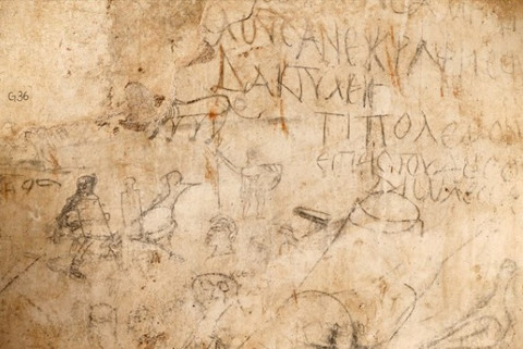 Galerinin tamamı için tıklayınızHABERLEŞMEK İÇİN Mİ? "Merkezde bulunan 'logos' kelimesi hem yukarıdan aşağı hem soldan sağa üçüncü sırada yer alıyor. Bu kelimenin o sırada burada bulunan Hristiyan topluluğun baskı altında oldukları dönemde birbiri ile haberleşmek için kullanıldığını iddia edenler var. Biz bunu bir bulmaca olarak görmek istiyoruz çünkü bu duvar resimlerinin önünde tezgahlar var. Burada çalışanların yaklaşımları, hayatları bu şekilde gözler önüne seriliyor."