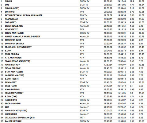 Galerinin tamamı için tıklayınızÇukur dizisi 28.09 share ile AB grubunda da zirveyi kaptı. 14.58 share ile TV8'de ekrana gelen Survivor ikinci sırada yer alırken, üçüncü sırada ise 15.64 share ile Çukur (ÖZET) yer aldı.
