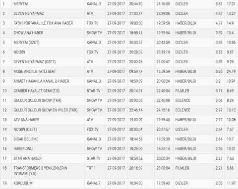 27 Eylül 2017 Çarşamba günü reyting sonuçları ne oldu? Çarşamba akşamları reytingde kıyasıya bir rekabet yaşanıyor. Hem Meryem hem de Seven Ne Yapmaz reytinglerde sıkı mücadele veriyor. Peki çarşamba akşamının galibi kim oldu? Meryem mi yoksa Seven Ne Yapmaz mı? 27 Eylül 2017 Çarşamba günü reyting sonuçları internethaber'de. 27 Eylül 2017 Çarşamba günü reyting sonuçları belli oldu. TOTAL ve AB sıralamasına göre reytinglerde kim birinci oldu? 27 Eylül 2017 Çarşamba günü reyting sonuçlarına göre gecenin birincisi Meryem oldu. İŞTE 27 EYLÜL 2017 ÇARŞAMBA GÜNÜ REYTİNG SONUÇLARI