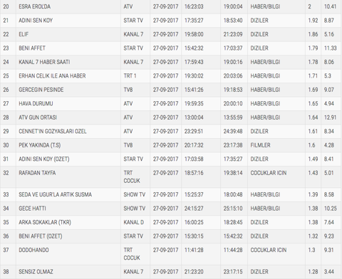 27 Eylül 2017 Çarşamba günü reyting sonuçları ne oldu? Çarşamba akşamları reytingde kıyasıya bir rekabet yaşanıyor. Hem Meryem hem de Seven Ne Yapmaz reytinglerde sıkı mücadele veriyor. Peki çarşamba akşamının galibi kim oldu? Meryem mi yoksa Seven Ne Yapmaz mı? 27 Eylül 2017 Çarşamba günü reyting sonuçları internethaber'de. 27 Eylül 2017 Çarşamba günü reyting sonuçları belli oldu. TOTAL ve AB sıralamasına göre reytinglerde kim birinci oldu? 27 Eylül 2017 Çarşamba günü reyting sonuçlarına göre gecenin birincisi Meryem oldu. İŞTE 27 EYLÜL 2017 ÇARŞAMBA GÜNÜ REYTİNG SONUÇLARI