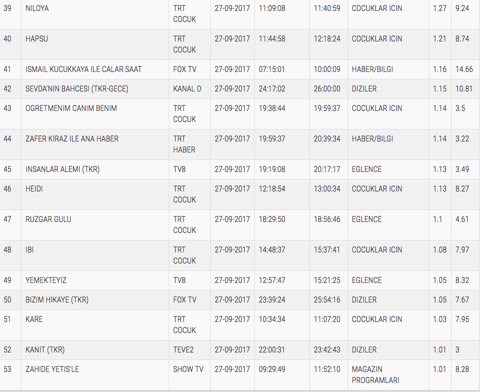 27 Eylül 2017 Çarşamba günü reyting sonuçları ne oldu? Çarşamba akşamları reytingde kıyasıya bir rekabet yaşanıyor. Hem Meryem hem de Seven Ne Yapmaz reytinglerde sıkı mücadele veriyor. Peki çarşamba akşamının galibi kim oldu? Meryem mi yoksa Seven Ne Yapmaz mı? 27 Eylül 2017 Çarşamba günü reyting sonuçları internethaber'de. 27 Eylül 2017 Çarşamba günü reyting sonuçları belli oldu. TOTAL ve AB sıralamasına göre reytinglerde kim birinci oldu? 27 Eylül 2017 Çarşamba günü reyting sonuçlarına göre gecenin birincisi Meryem oldu. İŞTE 27 EYLÜL 2017 ÇARŞAMBA GÜNÜ REYTİNG SONUÇLARI
