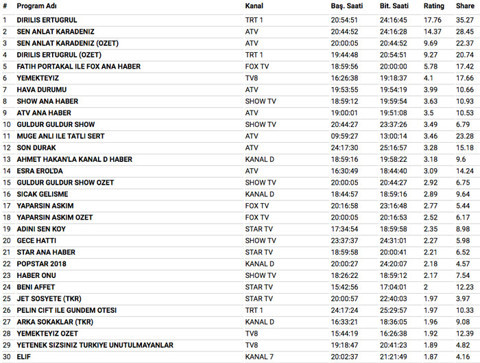Galerinin tamamı için tıklayınızAB grubunda ise 37.88 share ile Diriliş Ertuğrul zirveyi kaptı. İkinci sırada 25.94 share ile Sen Anlat Karadeniz yer alırken, üçüncü sırada ise 21.27share ile Diriliş Ertuğrul (ÖZET) yer aldı. Diriliş Ertuğrul ABC grubunda da 35.27 share ile zirvede yer alırken, ikinci sırada Sen Anlat Karadeniz, üçüncü sırada ise Sen Anlat Karadeniz (ÖZET) yer aldı.