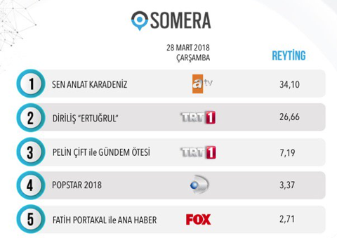 28 Mart 2018 reyting sonuçları bomba Diriliş Ertuğrul mu Sen Anlat Karadeniz mi