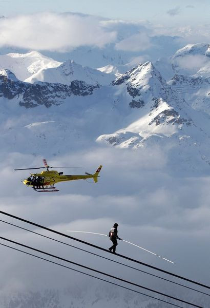 Galerinin tamamı için tıklayınızİsviçreli ip canbazı, Alpler’de kış turizmin merkezi St Moritz’deki Corvatsch Dağı’nda nefes kesen bir gösteriye imza attı.
