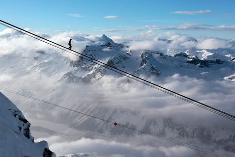 Galerinin tamamı için tıklayınızFreddy Nock (45), 3 bin 300 metre yükseklikte hiçbir güvenlik önlemi almadan teleferik telleri üzerinde adeta ölümle dans etti.