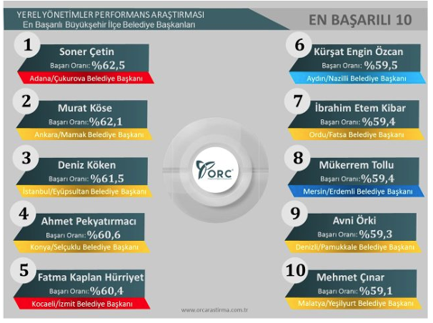 ORC Araştırma, 30 büyükşehirde görev yapan ilçe belediye başkanlarının performansıyla ilgili yaptığı ankette ilk sırada yüzde 62,5'lik başarı oranıyla Adana Seyhan Belediye Başkanı Soner Çetin yer aldı. 1-15 Ağustos 2020 tarihleri arasında 23 bin 200 katılımcıyla "En başarılı büyükşehir ilçe belediye başkanları" araştırması gerçekleştirildi.Şirket, araştırmaya nüfusu 10 binden düşük olan ilçeleri almadı.İstanbul'dan sadece bir ismin yer aldığı ankette Eyüpsultan Belediye Başkanı Deniz Köken yüzde 61,5'lik oranla 3. sırada kendine yer buldu.İlk Adana Seyhan Belediye Başkanı Soner Çetin'in olduğu ankette ikinci sırada yüzde 62,1'lik oranla Ankara Mamak Belediye Başkanı AK Partili Murat Köse yer aldı.3. sırada ise İstanbul Eyüpsultan Belediye Başkanı AK Partili Deniz Köken yüzde 61,5'lik oranla kendine yer buldu. Köken, "30 büyükşehirdeki en başarılı ilçe belediye başkanları" araştırmasında İstanbul'dan ilk 10'da yer alan tek isim oldu.