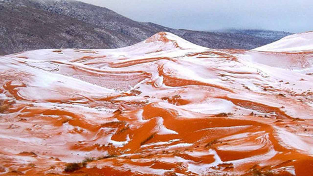 9.000.000 km² alanı ile dünyanın en büyük çölü Sahra ABD'yi yutacak büyükteki Sahra çölü aynı zamanda 37 derelik sıcaklığı ile yağmur ve karın çok çok nadir yağdığı bir iklime sahip . İlginç olan şu ki Sahra Çölü'ne 37 yıl sonra kar yağdı. Karim Bouchetata tarafından görüntülenen kar sadece bir kaç saat kalsa da dünya gündemine girdi.