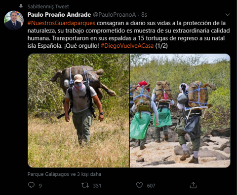 Galerinin tamamı için tıklayınızEkvador Çevre Bakanı Paulo Proano, Diego’nun da aralarında bulunduğu dev kaplumbağaların ıssız Espanola adasına nakledildiklerini “10 yıllar süren çabalarının ardından evlerine dönüyorlar” notuyla Twitter hesabından duyurdu.