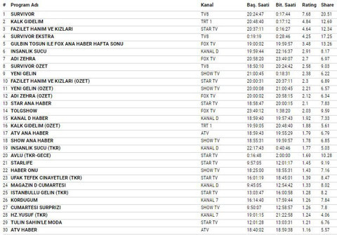 Galerinin tamamı için tıklayınız7 Nisan 2018 Cumartesi günü reyting sonuçları belli oldu. Total'de 19.14 share ile TV8'de ekrana gelen Survivor zirvede yer aldı. İkinci sırada 14.44 share ile Show TV'de yayınlanan Yeni Gelin yer alırken, üçüncü sırada ise 11.11 share ile Fazilet Hanım ve Kızları yer aldı.