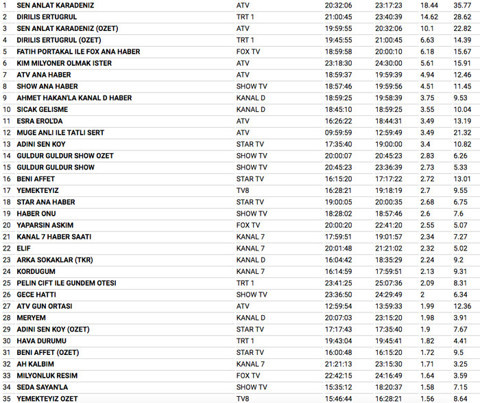 Çarşamba günleri işler gitgide kızışıyor. Kim derdi ki Diriliş Ertuğrul final yapmadan başka bir dizi gelip bileğini bükecek. Bundan 3-4 hafta öncesine kadar hiç kimse buna ihtimal vermezdi ama malesef Diriliş Ertuğrul Total sonuçlarda kan kaybetmeye başladı. Çarşamba akşamları TRT 1 ekranlarında Diriliş Ertuğrul, ATV ekranlarında Sen Anlat Karadeniz, Kanal D ekranlarında Meryem ve FOX TV ekranlarında İlker Ayrık'la Yaparsın Aşkım yer alıyor. Rekabetin kıyasıya olduğu bu akşamda izleyiciler neyi izleyeceğini şaşıyor adeta. ATV de yayın hayatına yeni başlayan Sen Anlat Karadeniz kaynayan kazanı iyice kızıştırdı. Peki reytinglerde neler oldu? Peki 7 Şubat 2018 Çarşamba akşamı reytinglerinde kim galip geldi? İşte 7 Şubat 2018 Çarşamba reyting sonuçları... Sen Anlat Karadeniz Total'in, Diriliş Ertuğrul AB ve ABC1'nin zirvesinde... Akşamın ilk iki sıralaması ve zirve ortakları olan diziler bu hafta yine değişmedi. Peki Sen Anlat Karadeniz, Diriliş Ertuğrul'un seyircisini çaldı mı? Listenin geri kalanında durum ne? Beraber bakalım! Show TV'nin sevilen programı Güldür Güldür Show, Total'de on beşinci olurken, AB'de dokuzuncu ve ABC1'de on birinci oldu. Kanal D'nin sevilen dizisi Meryem ise Total'de yirmi sekizinci olurken, AB'de on dokuzuncu ve ABC1'de yirmi dördüncü oldu. atv'nin sevilen yarışması Kim Milyoner Olmak İster dün akşamı tüm gruplarda altıncı olarak tamamlayarak akşamın en çok izlenenlerinden oldu. Ana Haber Bültenleri yine akşamın en çok izlenenlerinden olurken, FOX'un sevilen yarışması Yaparsın Aşkım'da Total ve ABC1 gruplarında ilk yirmi sıralamasında yer aldı. Gündüz kuşağında ise ilk beş şöyle sıralandı;1- atv: Esra Erol'da - Total: 11 AB:142- atv: Müge Anlı ile Tatlı Sert - Total: 12 AB:153- tv8: Yemekteyiz- Total: 17 AB: 104- Show TV: Seda Sayan - Total: 34 AB:315- Show TV: Gelin Evi - Total: 40 AB: 41 Sosyal medya ise Sen Anlat Karadeniz'i ve Diriliş Ertuğtrul'u konuştu. İŞTE 7 ŞUBAT 2018 TOTAL REYTİNG SONUÇLARI;