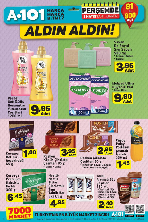 Galerinin tamamı için tıklayınızA101 3 Mayıs aktüel güncel indirim kataloğunu yayınladı. A101 3 Mayıs aktüel kataloğu bu hafta 9 sayfadan oluşuyor. 7000 den fazla şubesi ile 81 ilde bulunan A101 marketleri 3 mayıs kataloğu ile yine müşterilerini indirim bayramı yaşatacak. Kozmetikten, gıdaya küçük ev eşyalarına kadar onlarca farklı ürün bu hafta yine indirimde.