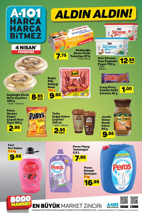 A101 4 Nisan 2019 Kataloğu yayınlandı. Nisan ayının ilk A101 Aktüel Ürünler kampanyası ile gelecek ürünleri sayfamızda sizlere sunduk. A101 Market mağazalarında 4 Nisan ile 10 Nisan 2019 tarihleri arasında geçerli olacak A101 Aldın Aldın kataloğunda yer alan tüm fırsatları listeledik. Bu safadaki incelememizde A101 30 Mart 2019 Cumartesi günü başlayan hafta sonu kampanyasını da bulabilirsiniz. İlk olarak A101 4 Nisan 2019 Aktüel Kataloğu ile gelecek ürünlere bakalım. 4 Nisan A101 Market kampanyasında bu haftanın öne çıkan aktüel ürünü Elton 55" EL55UAL08 Ultra HD Led oluyor. A101'de bu hafta 2.599 TL fiyatla satışa sunulan Elton 55" Ultra HD Led Tv 4 Nisan Perşembe gününden itibaren tüm A101 Market mağazalarında satışa sunuluyor.Elton 55" EL55UAL08 Ultra HD Led 2.599 TLCasper Via A2 Cep Telefonu 899 TLHI-LEVEL 16 GB Smart Çift Girişli USB Bellek 19,95 TLHI-LEVEL 16 GB Micro SD Kart 17,95 TLToshiba 32 GB USB 3.0 Bellek 27,95 TLAltus AL-1090 Tezgah Seviyesi Buzdolabı 549 TLSinger Promise 1408 Dikiş Makinesi 399 TLAprilla ABS-1025 Dijital Banyo Baskülü 34,95 TLSinbo 7338 Kablosuz Su Isıtıcı 69,95 TLArzum AR-4069 Practical 2'si 1 Arada Dikey Elektrikli Süpürge 139 TL2 Kapaklı 2 Çekmeceli Dolap 189,95 TL4 Sepetli Çok Amaçlı Dolap 99,95 TLLuminarc Arcopal Oval Servis Tabağı 12,95 TLLuminarc Arcopal Pizza Tabağı 12,95 TLLuminarc Arcopal Opal Kase 12,95 TLVerda Emaye Bakraç 34,95 TLDesenli Sürahi 1,5 Litre 7,95 TLBenekli Kase 2,95 TLDekoratif Seramik Kase 2,95 TLYuvarlak Kase 3,95 TLHobbylife Uzun Saklama Kabı 3,50 TLKare Saklama Kabı 3'lü 14,95 TLSeramik Kase 2,95 TLDolap İçi Raf 12,50 TLSaklama Kabı 9,95 TLAskılı Vakumlu Poşet 9,95 TLGold Baby Çift Yönlü Bebek Arabası 299,95 TLBebek Oyun Minderi 49,95 TLLisanslı Bebek Ayakkabısı 14,95 TLEbeveyn Başucu Kitabı 14,95 TLBebek Güvenlik Ürünleri 3,50 TLBebek Oto Koltuğu 239,95 TLFisher Price Mama Sandalyesi 299,95 TLGiderli Şeffaf Bebek Küveti 24,95 TLŞeffaf Kulplu Maşrapa 2,50 TLSu Kovası 9,95 TLOyuncak Kamyon Bultak 9,95 TLOyuncak Emekleme Topu 9,95 TLOyuncak Araba Lazımlık 22,50 TLLolla's Petite Aksesuarlı Bebekler 19,95 TLLolla's Petite Tenis Oyunuyor 19,95 TLOyuncak Kutusu 22,50 TLBebek Askısı 6'lı 2,95 TLBüyük Çocuk Sandalyesi 24,95 TLDesenli Çocuk Sandalyesi 6,95 TLKlozet Adapötrü 3,95 TLYenidoğan Bebek Aksesuarları 5,95 TLDesenli Pipetli Matara 4,50 TLLisanslı Matara 8,50 TLLisanslı Pipetli Bardak 5,95 TLSilk&Blue Eşleşen Bayan Çorap 2'li 2,95 TLSilk&Blue Eşleşen Bebek Çorabı 2'li 2,95 TLKaymaz Dilimli Kadife Çekyat Örtüsü 29,95 TLLisanslı Kız / Erkek Bebek Uzun Kollu Pijama Takımı 16,95 TLLisanslı Kız / Erkek Bebek Zıbın ve Tek Alt Seti 14,95 TLMarie Claire Çocuk Pamuklu Üçgen Sütyen 12,95 TLMarie Claire Bayan Desenli Kaplı Sütyen 15,95 TLMarie Claire Bayan Pamuklu Üçgen Sütyen 15,95 TLEti Paykek Kek Çeşitleri 200g 3,75 TLEti Burçak Kakao Kremalı Yulaflı Bisküvi 248g 3,95 TLEti Keyfince Rulo Gofret Parçacıklı Çikolata 70g 4,25 TLEti Keyfince Sütlü Çikolata 70g 4,25 TLEti Benim'o Çikolata Kaplamalı Hindistan Cevizli Marsmallowlu Bisküvi 216g 5,95 TLEti Benim'o Hindistan Cevizli Marsmallowlu Bisküvi27g 0,75 TLEti Kremalı Bisküvi Çeşitleri 77g 1 TLEti Süt Burger Hindistan Cevizli 35g 1,35 TLEti Sütlü Çikolata 70g 3,25 TLEti Karam Bitter Çikolata 70g 3,25 TLEti Bütün Antep Fıstıklı Çikolata 70g 4,95 TLEti Karam Fıstıklı Bitter Çikolata 70g 4,95 TLEti Wanted Bumba Hindistan Cevizli Bar Çikolata 40g 1,25 TLEti Maximus Loading Yer Fıstıklı Bar Çikolata 50g 1,45 TLKeskinoğlu Gezen Tavuk Yumurtası 10'lu 7,75 TLOtat Sürsene Taze Kaymaklı Peynir 700g 12,95 TLPatos Nachos Peynir Çeşnili Mısır Cipsi 109g 2,95 TLJacobs Velour Klasik Kahve 95g 9,95 TLSeyidoğlu Kürek Helva Çeşitleri 400g 8,95 TLBeşler Piliç Kokteyl Sosis 700g 9,95 TLCrazy Pirinç Patlaklı Sütlü Çikolata 30g 1 TLTorku Soğuk Kahve Çeşitleri 230ml 2,95 TLFest Sıvı Sabun 3,5 Kg 9,95 TLPeros Bulaşık Deterjanı 5 Kg 16,95 TLPeros Yüzey Temizleyici 2,5 Litre 7,95 TLŞimdi ise A101 30 Mart - 5 Nisan 2019 Hafta Sonu İndirimleri ile gelecek ürünleri ve bu ürünlerin indirimli fiyatlarını listeleyelim; Çerezya Çiğ Badem 150g 9,95 TLYumurta 15'li 6,75 TLÇaykur Tiryaki Siyah Çay 1000g 23,45 TLYörsan Ev Tipi Yoğurt 5 Kg 16,95 TLFeast / Beşüzzi Dondurulmuş Mozaik Pasta 750g 10,95 TLCappy %100 Meyve Suyu Çeşitleri 1 Litre 3,95 TLToblerone Ballı Nugalı Sütlü Çikolata 35g 1,75 TLDoydi Kavala Kurabiyesi 290g 4,75 TLPril Bulaşık Deterjanı 1500ml 11,75 TLSilk&Blue Bay Boxer 4,95 TLActivex Antibakteriyel Sıvı Sabun 650ml 6,45 TL (10 TL ve üzeri alışverişlerde geçerlidir)Berona Makarna Çeşitleri 500g 4,20 TL (3 adet fiyatı)Tarabya İzmir Tulum Peyniri 250g 14,90 TL (2 adet fiyatı)Bozbeyi Tam Yağlı Olgunlaştırılmış Beyaz Peynir Çeşitleri 350g 20,90 TL (2 adet fiyatı)Çokca Acı / Tatlı Ketçap 1000g 12,45 TL (3 adet fiyatı)CP Piliç Nugget 380g 8,65 TL (2 adet fiyatı)Ülker Ptibör Bisküvi 450g 9,95 TL (3 adet fiyatı)Gliss Şampuan Çeşitleri 550ml 23,80 TL (2 adet fiyatı)