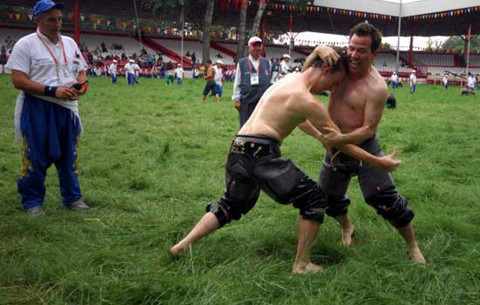 Galerinin tamamı için tıklayınızDavul zurna eşliğinde dizlerine vurarak er meydanına dalan ABD'li yönetmenler güreşmekten çok keyif aldılar. Özellikle peşrevleri halktan büyük alkış aldı.