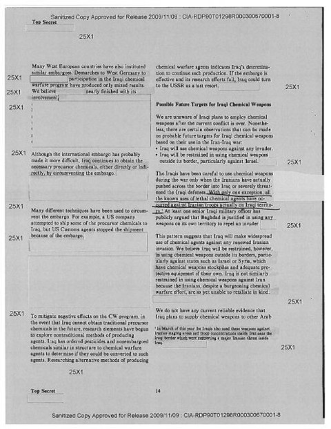 CIA'in CIA'in 1980’li yıllarda İran'a yönelik kimyasal saldırıda Saddam Hüseyin rejimine destek verdiğini gösteren belgeler ortaya çıktı. Bugüne kadar gizli tutulan bazı raporlar Foreign Policy dergisi tarafından yayınlandı. Gizli belgelere göre; Amerikan istihbaratı 1984’ten itibaren o dönemdeki ittifakı olan Irak’ın, 1980’den 1988’e kadar süren İran’a karşı savaşta kimyasal silah stokuna sahip olduğunu biliyordu. İşte o belgelerden bir kısmı