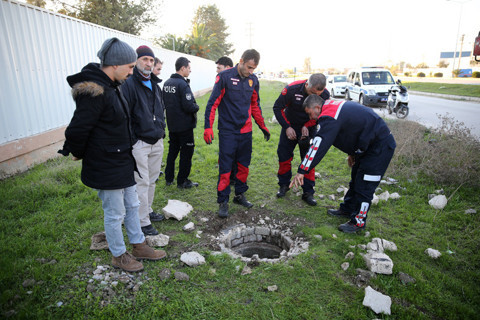 Galerinin tamamı için tıklayınızDaha sonra halat bağlanan hayvan düştüğü kanaldan çıkardı. İneğin fark edilmesini sağlayan köpek ise çalışma sırasında bölgeden ayrılmadı. Erkan Savun, motosikletiyle geçtiği sırada bir köpeğin rögarın yanında havladığını gördüğünü, ineği fark etmesi üzerine de durumu itfaiyeye bildirdiğini anlattı. Adana Büyükşehir Belediyesine bağlı zabıta ekiplerine teslim edilen ineğin sahibi aranıyor.