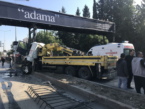 Turhan Cemal Beriker Bulvarı İstiklal Mahallesi yakınında Hasan Eroğlu yönetimindeki 35 AN 641 plakalı vinç kontrolden çıkarak yaya üst geçidinin ayağına çarptı. Kazada sürücü ve yanındaki oğlu Hüseyin Eroğlu aracın kabininde sıkıştı. Zamanla yarıştılar: Olayı gören vatandaşlar hemen polis, sağlık ve Can-Kur ekiplerine haber verdi. Olay yerine gelen ekipler çekici de sıkışan baba ve oğlu kurtarmak için zamanla yarıştı. Ailesi ve yakınları şoke oldu: Çekiciden önce Hüseyin Eroğlu kurtarılarak ambulansa alınırken, bir süre sonrada baba kurtarılarak diğer ambulansa alındı. Eroğlu ailesinin yakınları ve mesai arkadaşları olay yerine gelip kazayı görünce şok oldu. Kazanın videosu için tıklayınMeraklı gözlerle izlediler: Direğe saplanan çekicinin çıkarılması için çalışma başlatırken meraklı vatandaşlar, küçük çocuklar da olayı film izler gibi izledi. Bu arada D-400 kara yolunda hem Ceyhan hem de Mersin istikametinde trafik kontrollü olarak sağlandı.Sağlık durumları ciddiyetini koruyor: Hastaneye kaldırılan baba ve oğulun hayati tehlikesinin olduğu öğrenildi. Kaza nedeniyle demir bariyerlerde de zarar oluştu.