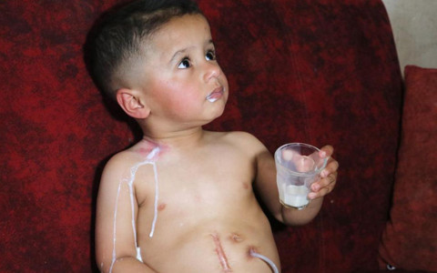 Adana'da yemek borusu olmayan Muhammed'in içtiği sıvılar boynundan fışkırıyor