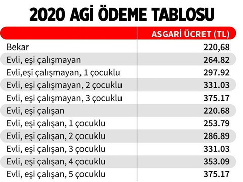 1 Ocak 2021 itibariyle AGİ ve Asgari ücrette yeni tarife uygulanacak. Milyonlarca çalışanı ilgilendiren Asgari ücret bekar biri için AGİ dahil net 2 bin 825 TL olarak belirlendi. 2021 yılı için brüt asgari ücret ise 3 bin 577 lira 50 kuruş oldu. Asgari ücrete yapılan zam oranı yüzde 21.5 civarında. Totalda gelen zam 500 TL. Üç çocuklu bir kişinin alacağı asgari ücret AGİ ile birlikte 3 bin 15 lira olacak. Peki AGİ ne kadar zamlandı, işte yeni AGİ ödeme tablosu:İşçi kesimini temsil eden Türk-İş, 2021 yılı için asgari ücretin 3 bin lira üzerinde olması gerektiğini açıklamıştı. Beklenti tam olarak karşılanmadı. Ancak AGİ dahil çocuklu aileler 3 bin liranın üstünde bir asgari ücrete sahip olacak. Bekar olanlar için AGİ dahil asgari ücret net 2 bin 825 lira oldu. AGİ ödeme tablosu 2021 yılı rakamları2021 yılında asgari ücrete yapılan yüzde 21.6 oranındaki zam AGİ'ye de uygulandı. Böylece 3 çocuklu bir çalışan 3 bin 15 lira AGİ dahil ücret alacak.AGİ 2021 yılı ödeme tablosu şöyle:Bekar için 2021 yılı AGİ - 220 liradan 268 TL'ye çıktıEvli eşi çalışmayan için yeni AGİ 321 liraEvli eşi çalışmayan 1 çocuklu için AGİ 362 liraEvli eşi çalışmayan 2 çocuklu için AGİ 402 liraEvli eşi çalışmayan 3 çocuklu için AGİ 456 liraEvli eşi çalışmayan 4 çocuklu için AGİ 456 liraEvli eşi çalışmayan 5 çocuklu için AGİ 456 liraEvli eşi çalışan için yeni AGİ 268 liraEvli eşi çalışan 1 çocuklu için yeni AGİ 308 liraEvli eşi çalışan 2 çocuklu için yeni AGİ 348 liraEvli eşi çalışan 3 çocuklu için yeni AGİ 402 liraEvli eşi çalışan 4 çocuklu için yeni AGİ 429 liraEvli eşi çalışan 5 çocuklu için yeni AGİ 456 liraAGİ maaşa dahil mi?: Asgari Geçim İndirimi olarak aldığınız rakam maaşa dahil değildir. İşveren maaşınızın dışında bu ücreti ödemekle yükümlüdür. AGİ ödemesini yapmayan işverenler cezaya tabi olurlar.AGİ'yi kimler alabilecek?: -Gerçek usülde vergiye tabi olan tam mükellef gerçek kişiler, -Ücret gelirlerini yıllık beyanname ile bildiren mükellefler yani tevkifata tabi tutulmayanlar, -Gelir vergisi kanununun 61. maddesi kapsamında ücret geliri elde edenler (Sosyal Güvenlik Destekleme Primine tabi çalışan emekliler, Kurumların yönetim kadrolarında görevli olanlar)AGİ çocuk yardımı şartları : AGİ çocuk sayısına göre farkediyor. Ancak çocuk ücreti dahil edilmesi için şu şartlar gerekiyor: *Mükellefle aynı adreste ikamet eden ya da mükellefin bakmakla yükümlü olduğu (Mükellef tarafından nafaka ödenenler, evlat edinilen çocuklar, ana ve babasını kaybetmiş dede ve nenesi tarafından bakılan çocuklar da dahil)-18 yaşını doldurmamış çocuklar,-Okuyan çocuklardan 25 yaşını tamamlamamış olanlar asgari geçim indiriminden faydalanılır.Çalışan anne babada çocukların AGİ'si kime yatar?: Hem anne hem de baba çalışansa çocuklar kimin üzerinden sağlık güvencesi alıyorsa o kişi çocukları için asgari geçim indiriminden faydalanabilmektedir.2020 yılındaki AGİ ödeme tablosu da şöyleydi:Yıllar içinde asgari ücret rakamları 2019 ASGARİ ÜCRET: 2 bin 20 TL2018 ASGARİ ÜCRET: 1603 TL2017 ASGARİ ÜCRET: 1404 TL2016 ASGARİ ÜCRET: 1300 TL2015 ASGARİ ÜCRET: 1 Ocak-949TL, 1 Temmuz-1000 TL2014 ASGARİ ÜCRET: 1 Ocak-846 TL, 1 Temmuz-891 TL2013 ASGARİ ÜCRET: 1 Ocak-773 TL, 1 Temmuz-803 TL