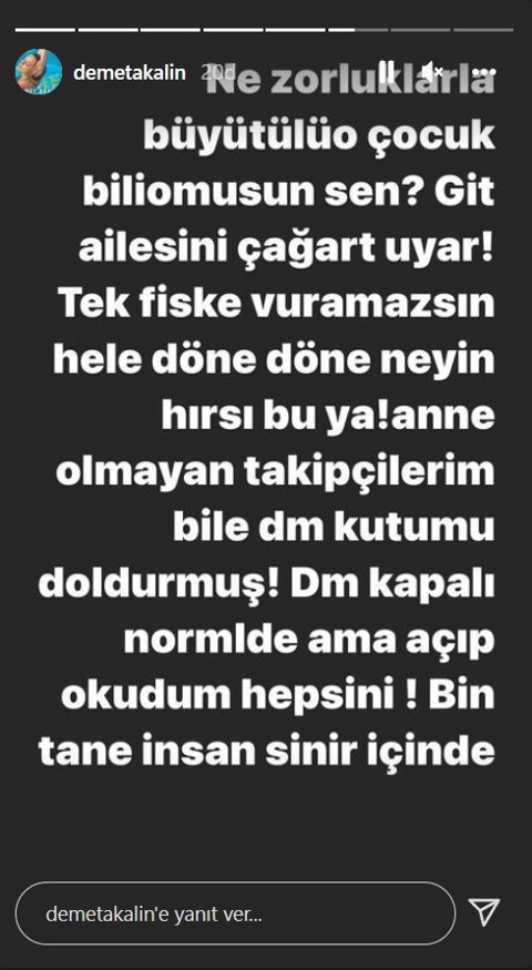 "Ne zorluklarla büyütülüyor çocuk biliyor musun sen? Git ailesini çağırt, uyar! Tek bir fiske vuramazsın,hele döne döne... Neyin hırsı bu ya! Anne olmayan takipçilerim bile DM kutumu doldurmuş. DM kapalı ama normalde, açıp okudum hepsini. Bin tane insan sinir içinde."