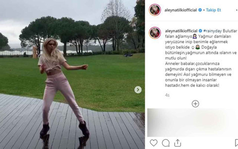 Aleyna Tilki, yaptığı dansla yağmurun tadını çıkardığı videosunun altına "Bulutlar falan ağlamıyor. Yağmur damlaları yeryüzüne inip benimle eğlenmek istiyor belkide.