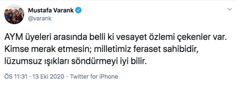 Galerinin tamamı için tıklayınızSanayi ve Teknoloji Bakanı Mustafa Varank twitter hesabından "AYM üyeleri arasında belli ki vesayet özlemi çekenler var. Kimse merak etmesin; milletimiz feraset sahibidir, lüzumsuz ışıkları söndürmeyi iyi bilir' diye yazdı.