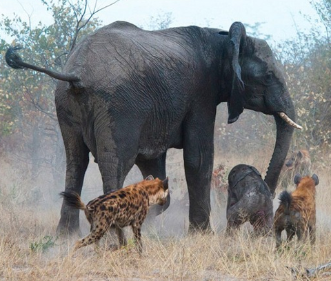Botswana'da çekilen bu fotoğraflar, tam 18 çakalın saldırısına uğrayan yavrusunu kurtarmaya çalışan anne filin dramatik mücadelesini yansıtıyor.