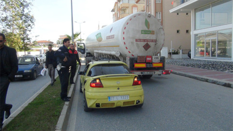 Galerinin tamamı için tıklayınızANTALYA'nın Manavgat ilçesinde polisin dur ihtarına uymayan sürücü, polisin anonsuyla seyir halindeki bir tır şoförü tarafından sıkıştırıldı. Hareket edemeyen otomobilin sürücüsü kelepçelenerek gözaltına alındı. Olay bu sabah saatlerinde meydana geldi. Edinilen bilgiye göre, Manavgat Emniyet Müdürlüğü Trafik Denetleme Büro Amirliği ekiplerince Sorgun Bulvarında motosikletlere yönelik uygulama yapılırken yüksek sesli müzik ve egzoz sesiyle çevreyi rahatsız ettiği gerekçesiyle durdurulmak istenen Sevban Enes K. idaresindeki 07 L 1323 plakalı spor otomobilin dur ihtarına uymadığı anons edildi.