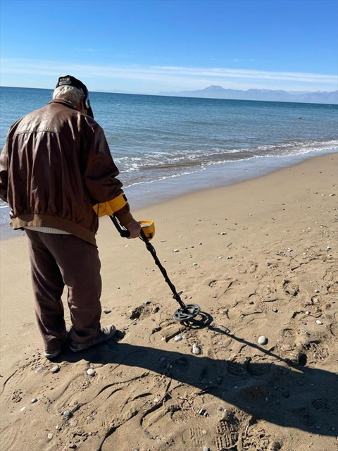 Galerinin tamamı için tıklayınızDeniz ve Uysal, turistlerin meraklı bakışları altında dedektör ve çapayla plajda değerli metalleri arıyor.
