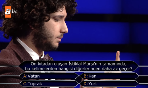 Galerinin tamamı için tıklayınız•"On kıtadan oluşan İstiklal Marşı'nın tamamında, bu kelimelerden hangisi diğerlerinden daha az geçer?" sorusunu yöneltilen Arda Ayten'in bir milyonluk soruyu bilip bilmediği merak konusu olmuştu.