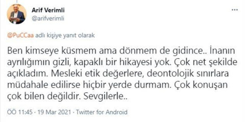 Galerinin tamamı için tıklayınızProf. Dr. Arif Verimli ise Pucca'nın paylaşımına, "Ben kimseye küsmem ama dönmem de gidince.. İnanın ayrılığımın gizli, kapaklı bir hikayesi yok. Çok net şekilde açıkladım. Mesleki etik değerlere, deontolojik sınırlara müdahale edilirse hiçbir yerde durmam. Çok konuşan çok bilen değildir. Sevgilerle.." yanıtını verdi.