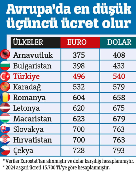 Asgari ücret, yüzde 40 artırılırsa 15.962 liraya çıkacak ve 550 dolar olacak. Yüzde 50 artırılırsa 17.103 lira olacak ve 589 dolara çıkacak. Asgari ücrette artış oranı yüzde 60 olursa 18.243 TL’yi görecek ve dolar karşılığı 629 olacak. Asgari ücret 629 dolar bile olsa Türkiye, Avrupa ülkeleri arasında en düşük beşinci ücrete sahip ülke olmaya devam edecek. Üstelik Avrupa’da asgari ücretler yılın başında artırıldığında Türkiye’nin en düşük ücretler arasında yine sıra kaybetmesi bekleniyor.