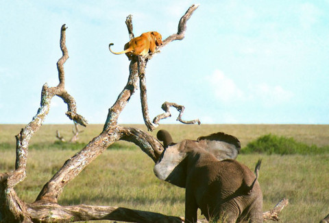 Bu pek de alışık olmadığımız bir görüntü Korkudan ağacın tepesine çıkmış bir aslan ve kızgın bir fil.. Serengiti'de dişi bir aslan küçük bir fil sürüsüne yaklaşınca cevabını çok sert bir şekilde aldı.. Sürünün lideri fil dişi aslanın etrafından dönmesinden rahatsız olup onu kovalamaya başladı sonunda dişi aslan çareyi kuru bir ağaç dalına çıkıp beklemekte buldu bir süre aslanın inmesini bekleyen fil daha sonra sıkılıp sürüsünün yanına döndü aslan ise uzun süre ağaçtan aşağı inmedi..