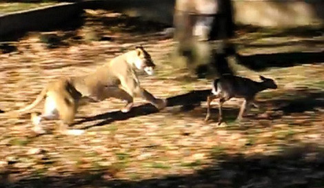4 tarafı çevrili hayvanat bahçesinde Yavru geyiğin üzerine atlayan aslan herkesi şaşkına çevirdi. Müthiş avlanma saniye saniye görüntülendi.