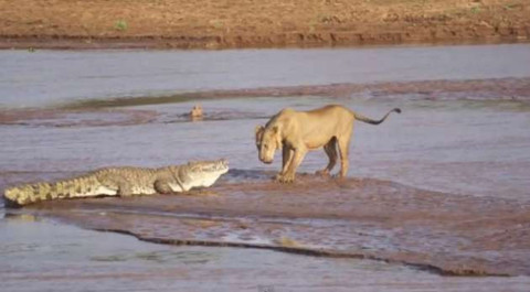 Galerinin tamamı için tıklayınızÜç aslan ve bir timsah amansız bir mücadeleye tutuştu. Fil eti için verilen savaş sürprizle sonuçlandı.