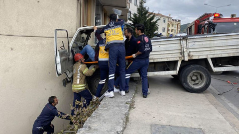 Kamyonetin ön tekerleri, bina duvarı ile yol arasındaki boşlukta asılı kaldı. Sürücü Ufuk Kör ise kamyonetinde sıkıştı.