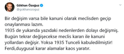 Athena grubunun solisti Gökhan Özoğuz, Tunceli'de belediye tabelasında "Tunceli" ibaresinin yerine "Dersim" kullanılması kararını sosyal medyadan eleştirdi. Tunceli Belediye Meclisi, Türkiye Komünist Partisi'nden aday olarak seçilen ve "Komünist Başkan" olarak bilinen Fatih Mehmet Maçoğlu başkanlığında yapılan olağan ve olağanüstü toplantılarda kararlar aldı.Tunceli Belediyesi, meclis toplantılarında alınan karara göre belediye hizmet binalarındaki tabelaların 'Dersim Belediyesi' olarak değiştirilmesinin oy çokluğuyla kabul edildiği bilgisi yer aldı. Son günlerde siyasi söylemleriyle gündem olan Gökhan Özoğuz, daha önce desteklediği Maçoğlu ile bu açıklama sonrası ters düştü.Meclis kararıyla değiştirilmeli Özoğuz Twitter hesabından "Bir değişim varsa bile kanuni olarak meclisden geçip onaylanması lazım. 1935 de yukarıda yazıdaki nedenlerden dolayı değişmiş. Bugün tekrar değişecekse meclis kararı ile kanuni yollardan değişir. Yoksa 1935 Tunceli kabul edilmiştir! Ferdi, duygusal karar almalar kaos yaratır" alınan kararın yerinde olmadığını dile getirdi.