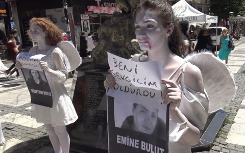 Galerinin tamamı için tıklayınızÖte yandan önlerinde öldürülen bazı kadınların isim ve fotoğrafları bulunan sanatçıların, Marmara Caddesi'ndeki Deprem Anıtı önünde 'Heykel' gibi hareketsiz duruşu kısa sürede ilgi topladı. Yoldan geçenler durarak heykel gibi hareketsiz duran yüzleri kanlı melekleri canlandıran 3 kadın ile elleri kanlı 2 erkek ve yöresel kıyafetli kadınları inceleyerek cep telefonları ile görüntüledi.
