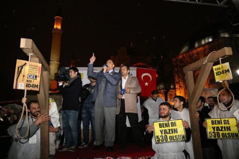 Galerinin tamamı için tıklayınızEllerinde MIsır bayrakları ve çeşitli afişler bulunan gruptakiler, Mısır'daki darbe yönetimi aleyhine sloganlar atarak, devrik cumhurbaşkanı Muhammed Mursi ve arkadaşları için dua etti. Daha sonra Mısırlı bir çocuk, "Kardeşim Sen Özgürsün" ezgisini seslendirdi. Ahmet Hakan Karagül ise "Ayasofya" ezgisini okudu.