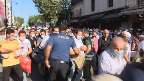 İstanbul Valiliği tarafından, kadınlar ve erkekler için ayrılan namaz kılma alanlarının duyurusu yapılıyor. Vatandaşlar, seccadeleri üzerinde namaz saatini beklerken, alandaki görevlilerce de su dağıtılıyor.
