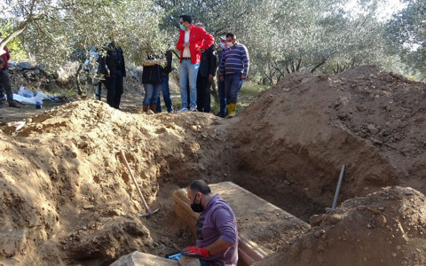 Galerinin tamamı için tıklayınızKazı alanında bir kısmı kazılmış ve ucu dışarıda lahit bulundu. Jandarmanın durumu yetkililere bildirmesi sonucu bölge koruma altına alındı. Definecilerin kazı yaptığı yerde yapılan çalışmalarda 2 lahit mezar bulundu.